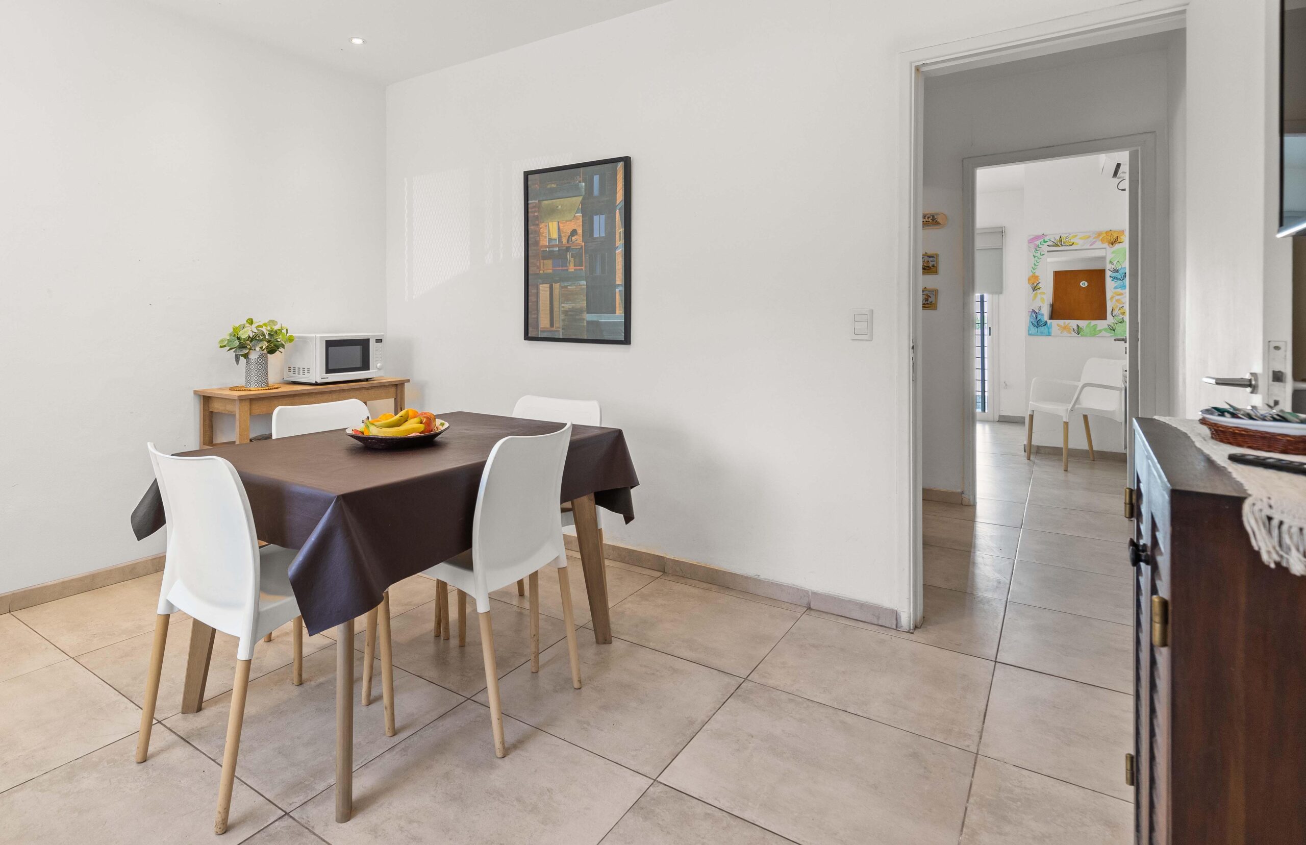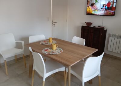• El comedor está equipado con amoblamiento estilo escandinavo (mesa y cuatro sillas), un televisor (Smart TV, 43 pulgadas) Netflix, Youtube. Y un sillón cama (sommier).