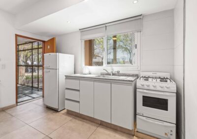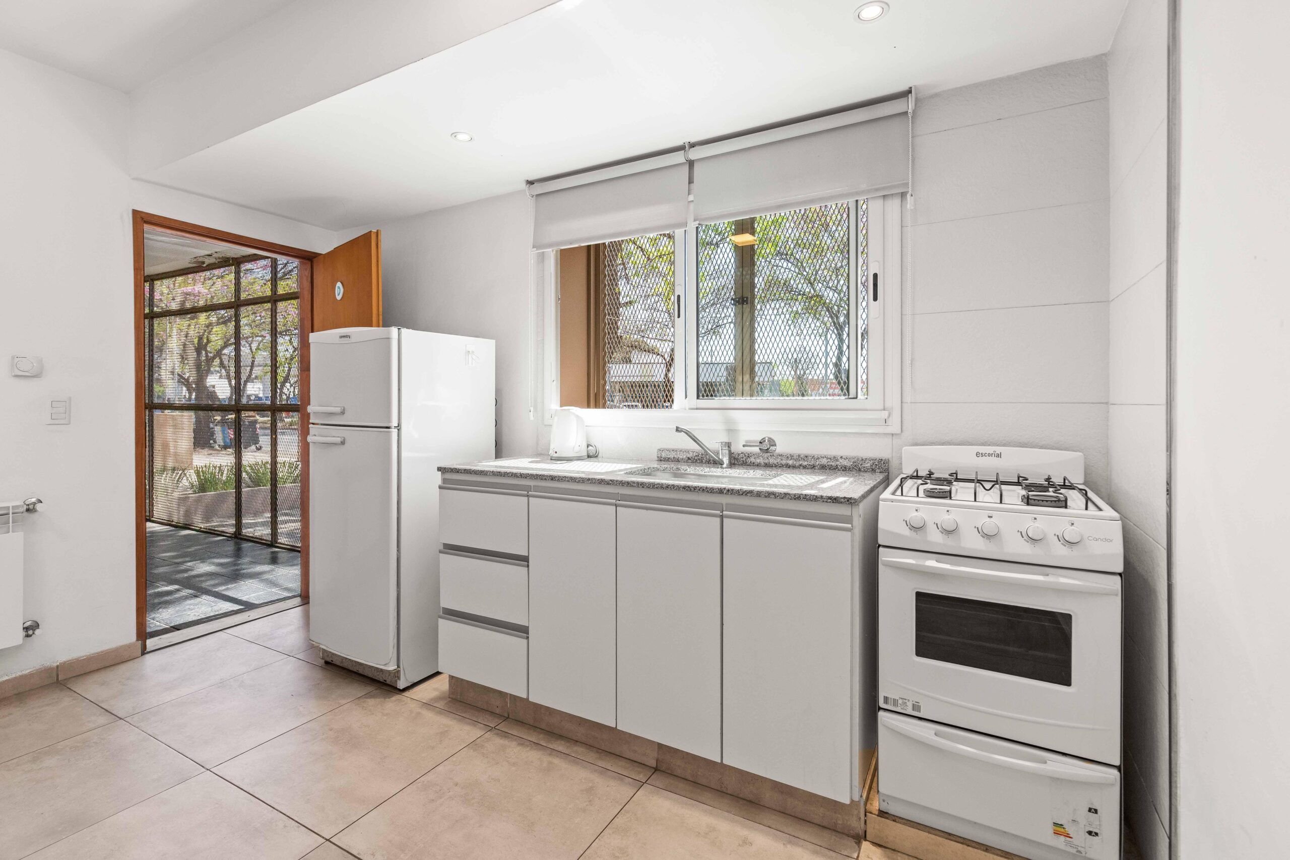 Un departamento luminoso, totalmente nuevo, con acceso a una pequeña galería de uso exclusivo y vista al jardín, Con todo el equipamiento necesario para una confortable estadía.